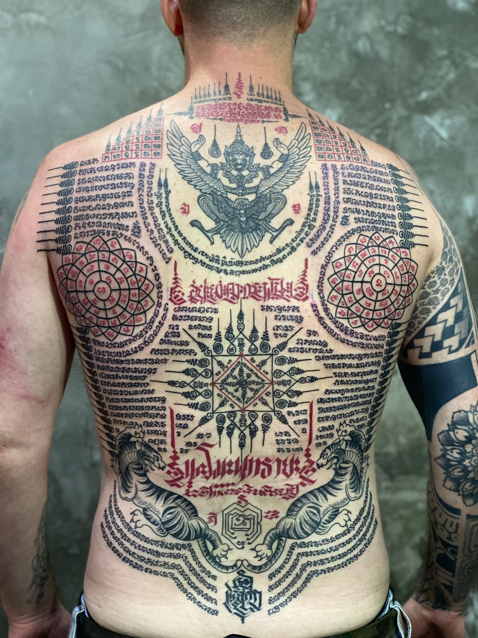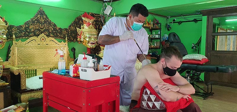 I have two tattoos that were done by monks at Wat Bang Phra. It's not "a spiritual touch no tattoo shop elsewhere can match." It's easy enough to go there yourself and have the tattoo done by monks and blessed in the temple. Tattooist extraordinaire Jimmy Wong brought me there the first time and translated for me. This was more than 20 years ago and I'm told the monk who did my tattoo was quite famous and that it was then blessed by the head monk of the temple. It was supposed to give me luck with women - how that turned out is debatable. There were a lot of people waiting for tattoos themselves - women in the morning, men in the afternoon, if I remember correctly. The second time I went there with my then-girlfriend, who translated for me. I had to give the monk 300 baht, a pack of cigarettes, and some incense sticks. This one meant I couldn't be shot or stabbed and so far it has worked.