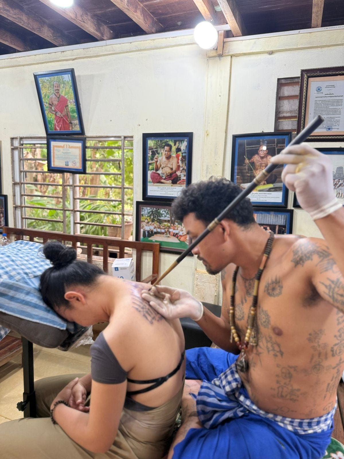 Talk to enough people and the roots of both hand-tapping and Sak Yants point to Cambodia. Angelina Jolie helped blast Cambodian tattoo culture into Hollywood’s spotlight, but for Cambodian artists themselves, bamboo tattooing is a serious, sacred craft with deep meaning and long apprenticeships.